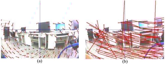 For example, Figure 3a,b shows the optical flow from a KLT feature tracker during a normal movement and a fast movement, respectively. The latter movement case being unordered, caused an inefficient estimate of the homography matrix. During large motion, the KLT feature tracker did fail. Thus, we used an IMU-aided motion estimator approach in the case of a large motion to reduce any motion vector error.