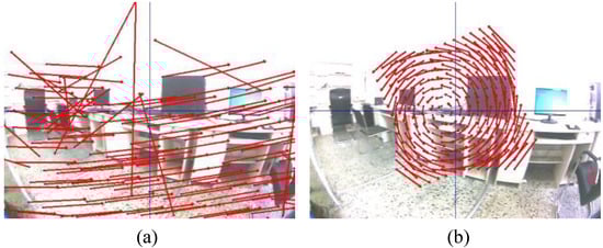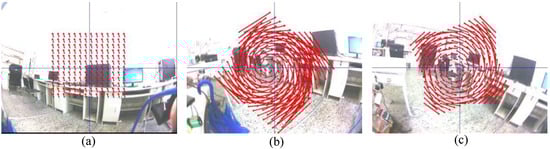 Therefore, from (9) and (10) can be generated by the motion vector from an IMU sensor. Direction and size of the motion vectors depend on the rotation measured. Figure 5 shows the motion vector that were calculated from set of points with different values of φ. For low rotation rate in Figure 5a, the pattern of the motion vector was similar in terms of direction and size. On the other hand, the pattern of the motion vector in fast rotation were in different direction and size, which was ordered, as illustrated in Figure 5b,c.