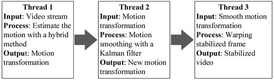 The primary process of the stabilized video has three steps: motion estimation, motion smoothing, and image warping. For implement our algorithm in real-time, we managed the execution of each step algorithm with the multi-threaded approach. It can be processed into an array of commands in a single process, executed independently along with sharing the processing resources. To array process of multi-threaded approach in the video stabilization, we separated into three processes: thread1 for motion estimation, thread2 for motion smoothing and thread3 for image warping as shown in Figure 7.