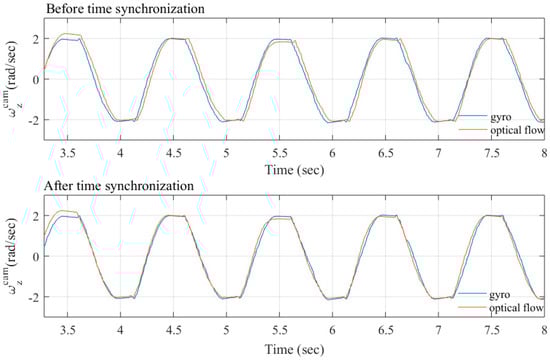 Moreover, the camera and the IMU sensor are synchronized and operate between both of the sensors to accurately read data in time by a cross-correlation method. The temporal synchronization assumed the delay from the sensors which is constant []. This is a simple and easy way to define time lag between the two measurements. It can identify the offset time by applying the small sinusoidal signal required for moving the camera around the z-axis to measure . Then, comparison of the average magnitude of optical flow and gyro data is done as shown in Figure 9. The optical flow is estimated with the image interpolation algorithm [] and the gyro data is calculated from Equation (1). The archived data from the optical flow and gyro data have the same phase included so the maximum phase lag between the two measured data represented by toff, equals to −0.035 s, as in our case.