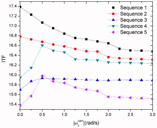 We used the IMU sensor data to optimize the switching threshold rotation speed. The switching threshold of different values resulted in low ITF while using the high to switch, as shown in Figure 10. Motion was not estimated at low rotation speeds during the high percentage case of motion estimation, as in Sequences 3–5. The highest IFT was obtained at equaled to 0.5 rad/s. IFT decreased in Sequences 1 and 2 while the switching threshold changed to a higher value, because it was not sufficiently active in the high-percentage case of low .