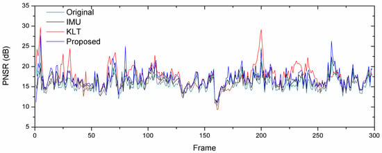 In Figure 12, we represent the PSNR of Sequence 1 that was used to calculate the ITF, as shown in Table 3 demonstrates the stabilized efficiency. It can be seen that the value of an original video is lower than the stabilized video in different motion estimation methods. The PSNR of the KLT tracker is higher than other methods, as shown by the data in Table 3 showing the latter with a high ITF. But some of the consecutive frames with a KLT tracker are under the original video, which means the stabilized video in the subsequent frame is rough due to a KLT tracker failure. On the contrary, with our proposed method maintains the PSNR over the original video. It means the whole video of our proposed method achieved smoothness without any rough display on the video.