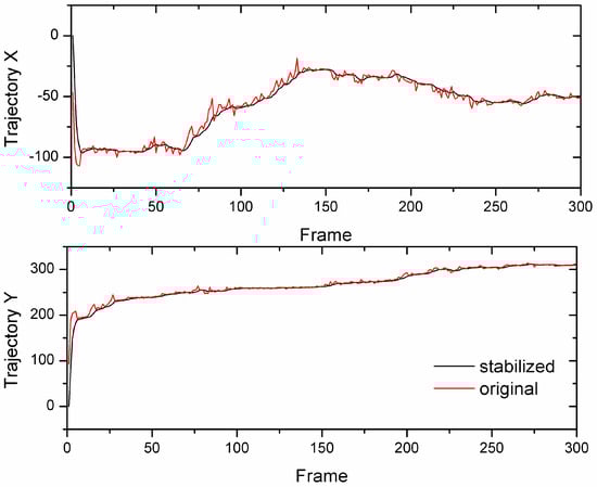 The effect of the motion is illustrated in Figure 13, which showed our effective approach in smoothening the large motion in Sequence 1 from the Kalman filter. It improved the evenness over the originally measured motion by removing the undesired motion in both the x and y trajectories. Both offsets in the x- and y-trajectories of the stabilized video was smoother than the original one and that calculating in real-time.