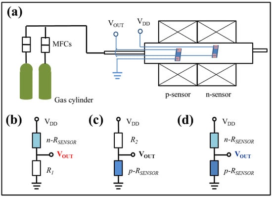 Schematics of the (a) gas sensor measurement system, (b) n-sensor, (c) p-sensor, and (d) p + n sensor array circuits.