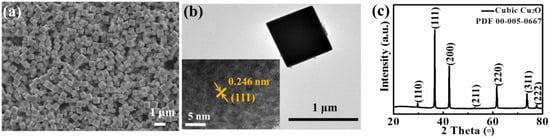 The p-type Cu2O material was typically cubes, as shown in the SEM and TEM images in Figure 2a,b, with an edge length of ~0.5 µm. The HRTEM image in Figure 2b shows the typical (111) plane spacing of 0.246 nm in the cubic phase. The cubic phase was also identified by the XRD pattern in Figure 2c in good accordance with the standard card Powder Diffraction File (PDF) 00-005-0667. The cubic shape was attributed to the relatively low surface energy of the (100) surfaces as compared with others such as (111). This is in good agreement with the literature reporting that if surfactant (e.g., polyvinyl pyrrolidone) is used to stabilize the (111) plane, then octahedral shaped Cu2O would be obtained, exposing (111) planes, and if there is no surfactant, cubes would be produced, exposing (100) planes [30,31,32].
