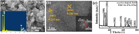 Subsequently, another typical n-type sensing material, 2.2 mol % Ga-doped ZnO, was prepared and characterized as shown in Figure 3. As shown in the SEM image in Figure 3a, the Ga-ZnO nanoparticles had a diameter of 20–50 nm, and Ga was identified by the EDS spectrum as shown in the inset. The plane spacings in the HRTEM image and the fast Fourier transmission (FFT) in Figure 3b correspond well with the lattice of ZnO. There was no extra Ga2O3 phase identified by the XRD pattern besides the hexagonal ZnO phase (PDF 01-076-0704), as shown in Figure 3c, because the Ga atoms are doped into the ZnO lattice in order to tune the resistance.