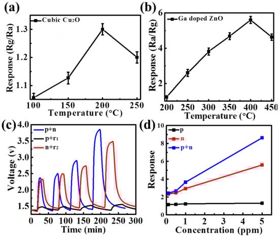 (a) Response of Cu2O p-sensor to 5 ppm ethanol at different working temperatures; (b) response of Ga-ZnO n-sensor to 5 ppm ethanol at different working temperatures; (c) responses of Ga-ZnO n-sensor, Cu2O p-sensor, and p + n sensor array to 5 ppm ethanol; and (d) relationship of Ga-ZnO n-sensor, Cu2O p-sensor, and p + n sensor array responses with ethanol concentrations.