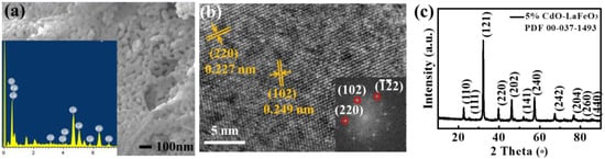 Characterizations of CdO-activated p-type LaFeO3: (a) SEM image and EDS spectrum (inset); (b) HRTEM and FFT (inset) and (c) XRD pattern.