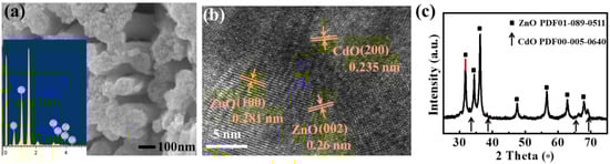 However, this kind of LaFeO3 material has a relatively large resistance in the order of 109 ohm, much higher than that of Cu2O and Ga-ZnO (106 ohm), making it difficult to integrate the sensor array with Ga-ZnO. Therefore, another kind of n-type material, Sn-doped ZnO, was prepared and activated by 10 mol % CdO decoration [35] to enhance the sensitivity. As shown in Figure 6a, the CdO/Sn-ZnO material was also composed of nanoparticles with a diameter of 10–50 nm, and Cd, Sn, Zn, and O were all identified by the EDS spectrum in the inset. The lattice spacings in the HRTEM image in Figure 6b correspond well with the ZnO lattice. Importantly, the XRD pattern in Figure 6c indicates the hexagonal phase of the ZnO material, with extra CdO-related weak peaks identified. This is due to the relatively higher dosage of CdO (10 mol %) than that in CdO/LaFeO3. It is noticed that both materials, CdO-activated LaFeO3 and Sn-ZnO, have a porous structure as shown in Figure 5a and Figure 6a, which favors the gas diffusion and reaction and would thus enhance the gas response.