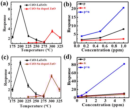 Responses of CdO-activated LaFeO3 and Sn-ZnO: (a,b) relationships of ethanol response with working temperature and concentration, respectively; (c,d) relationships of acetone response with working temperature and concentration, respectively.