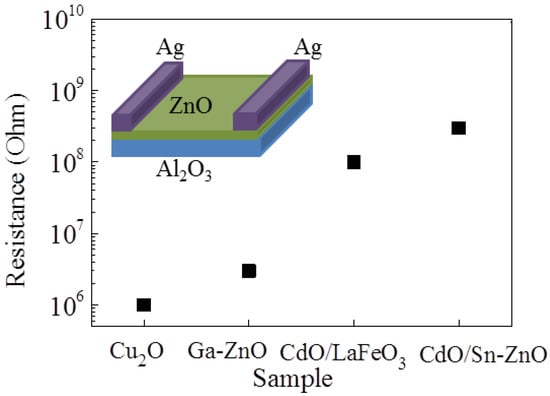 However, there is an issue with the complex resistance matching of the sensors. As mentioned above, sensors with a respective resistance of 109 and 106 ohm cannot be integrated into an effective sensor array because there would not be any significant voltage change in the circuit, as depicted in Figure 1c. For example, the voltage output on the 106-ohm sensor would be 0.005 V. A response of 10 would give an output voltage of only 0.05 V, which is too low to be effectively measured by the output circuits. The sensor resistances are plotted in Figure 8 to further illustrate this resistance matching problem. P-type Cu2O has a relatively low resistance, and that of n-type ZnO is orders of magnitude higher. Therefore, Ga was adopted as the effective dopant to reduce the resistance of n-type ZnO to a similar level to that of Cu2O. On the other hand, p-type LaFeO3 has a similar resistance to that of ZnO; thus, they can compose the sensor array. Additionally, the Sn dopant and the CdO activator were only used for enhancing the sensitivity of the material rather than tailoring the resistance. Therefore, all these results indicate the effective response enhancement of the well-tuned p + n sensor array for low-concentration gas detection.