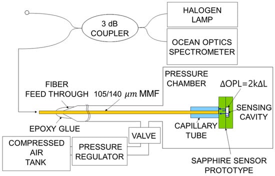 To enable pressure sensing in harsh environmental conditions, homogeneous optical crystal-based structures that can operate in high-temperature regimes may provide the next step in the pressure sensor evolution. Sapphire (α-Al2O3) has a high melting point, excellent corrosion resistance, and low optical loss [9]. These properties make single-crystal sapphire an ideal candidate for optical sensors that could operate in harsh environments. Homogeneous sapphire temperature sensors have been shown to operate with good reliability [10,11,12]. Pure sapphire melts at over 2050 °C, and thin sapphire optical fibers have exhibited the ability to resist plastic deformation at temperatures over 1650 °C [13]. Unlike SiC and polycrystalline alumina, single-crystal sapphire displays negligible corrosion under high-temperature exposure to alkaline gases [14]. However, further sensor evolution is required to monitor pressures at temperatures up to 1600 °C in corrosive or oxidizing environments.