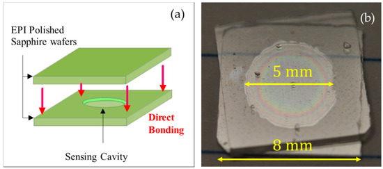 where P is the external pressure, a is the maximum radius at which the deflection is measured, E is the Young’s modulus, v is the Poisson’s ratio, and h is the sapphire wafer thickness. The two sapphire wafers shown in Figure 3b are both 330 µm thick and are assumed to deflect identically; the diameter of the sensing cavity area is 5 mm. Therefore, the theoretical maximum deflection w0 is 3.90 µm at 3.45 MPa.