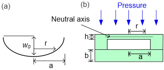 (a) Schematic of the small diaphragm deflection. (b) Schematic of the small deflection in the sensor cavity under uniform pressure: b is the thickness of the flat sapphire wafer, a is the maximum radius at which the deflection is measured, h is the thickness of the sapphire wafer containing the cavity, r is the radius from the center of the cavity at the measurement point, and w0 is the maximum deflection.