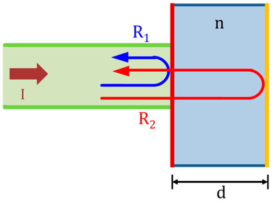 Schematic of the Fabry–Perot (FP) interferometric sensor: I is the normal incident light; the light reflects from two reflectors, R1 and R2; n is the refractive index of the cavity medium; and d is the depth of the air gap in the cavity.