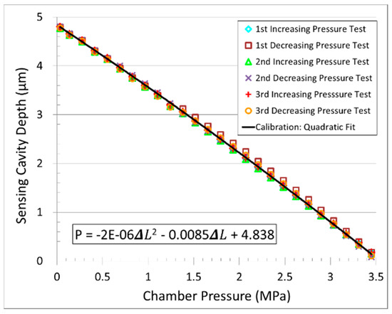 The dynamic sensor response is investigated by increasing and decreasing the pressure over a range of 0.03 to 3.45 MPa for three cycles, as shown in Figure 6. The sensor responds almost linearly over this pressure range, and hysteresis is below the level of measurement resolution. After each cycle, the sensor reverts to the same initial cavity length of 4.8 µm +/−0.008 µm at atmospheric pressure. However, there is no physical model, only a second-order polynomial. Thus, the good agreement between the experimental results and the regression is trivial. A calibration curve is fitted to the sensor data via a quadratic regression (R2 = 0.998) and is compared with data from an electronic pressure gauge. The theoretical model fits well with the experimental results. The pressure can be determined from the calibration curve, which is linear. Thus, the applied external pressure can be determined from the value of the sensing cavity depth, ΔL.