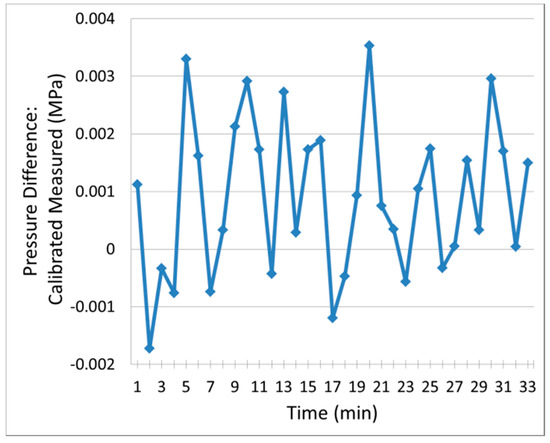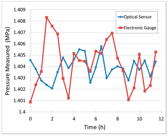 Sensor resolution is measured by checking the standard deviation of the calibrated sapphire sensor output at constant pressure, as shown in Figure 7. A small leak in the test chamber is compensated using pressure data measured by the electronic gauge. A total of 33 data points are obtained at 1-min intervals, with the chamber pressure maintained at 1.39 MPa. A sensor resolution of +/−0.003 MPa (2σ) is measured, which is equivalent to 0.19% of the tested range. Given that the accuracy of the electronic pressure gauge is only 0.017 MPa, it is possible that the sensor has an even higher resolution.