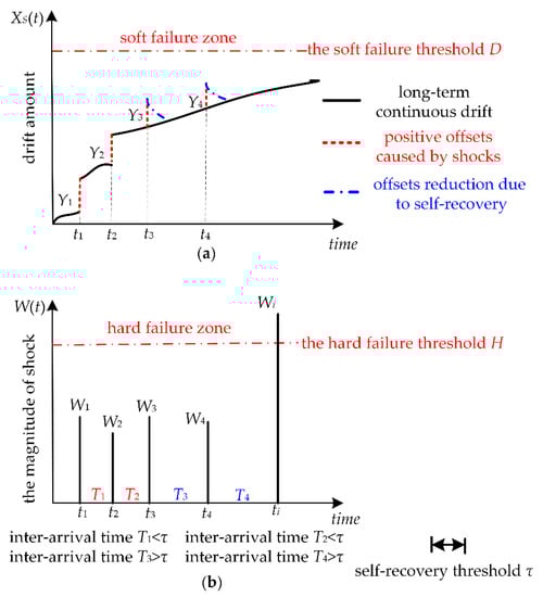 The failure of humidity sensors is due to two dependent competing failure processes as shown in Figure 1. The soft failure process is shown in Figure 1a, which is determined by long-term continuous drift, random shocks, and self-recovery. The long-term continuous drift between the humidity sensor’s measured values and the actual humidity is caused by physical aging and is often affected by random shocks. When the shock amplitude is less than a certain constant value H, that is, a non-fatal shock, the shock may cause an additional positive offset that arises between the sensor measured value and the actual humidity. The phenomenon wherein shocks can cause increases to degradation exists in many products. In particular, we propose that not all non-fatal shocks cause additional positive offsets. Only frequent shocks with an inter-arrival time of two continuous shocks less than a certain threshold can cause an increase to the long-term continuous drift of humidity sensors. This means that frequent shocks can cause positive offsets, and these offsets are accumulative. If the inter-arrival time of two continuous shocks is larger than a threshold value, once humidity sensors are returned to mild conditions, the offsets may decrease slowly. The self-recovery process is one of decline in positive offsets after a temperature or humidity shock. Self-recovery may be observed once samples are returned to mild environmental conditions. This indicates that this positive drift is a temporary offset that is fully reversible with slow kinetics after returning the sensor to a mild environment. The positive offset is not due to the irreversible damage to the sensing polymer, such as the hydrolysis of the chemical bonds linking the monomers. The positive offset is caused by the rapid environmental change which may self-recover. The hard failure process is shown in Figure 1b. The humidity sensor’s exposure to extreme shocks that exceed the threshold level H may cause hard failure. In summary, we assumed that humidity sensors are subject to MDCFPs which include both soft and hard failure. The two competing failure processes are dependent due to the shared exposure to random shocks.