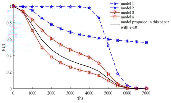 The four different reliability models (Models 1, 2, 3, and 4) used in previous studies are special cases of the proposed model as discussed in Section 3.4. All models are drawn and compared in Figure 8. The corresponding failure rate functions are shown in Figure 9. We also found that when considering only hard or soft failure, the reliabilities were higher than that when both failures had a competitive relationship, the failure rate functions were not 0 within a certain time, and not all the whole time of service. The three reliabilities of competing failure had some of the same change trends. The reliability of the independent competing is the highest, followed by the reliability of the dependent competing with considering self-recovery.