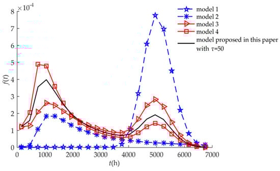 The failure rate functions of Equations (14), (16), (18), (20), and (22) are shown in Figure 3. When only hard failure was considered (Model 1), the failure rate increased significantly after 4000 h. In contrast, when only soft failure was considered (Model 2), the rate was mainly concentrated prior to 4000 h. For the three competing models (Models 3, 4, and the proposed model), the failure rate functions were almost non-zero throughout the service life of the humidity sensors, that is, the humidity sensors could fail at any time during service. When only soft failure or hard failure was considered, the humidity sensors could fail within a specified time.