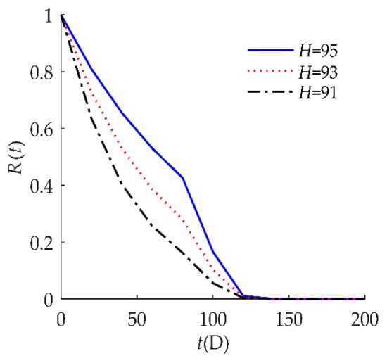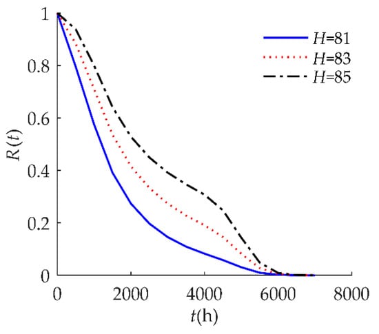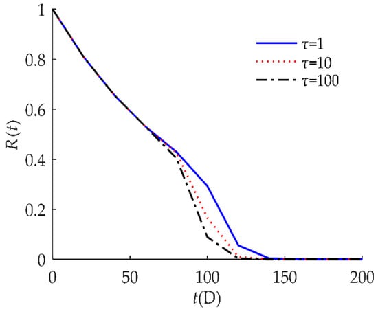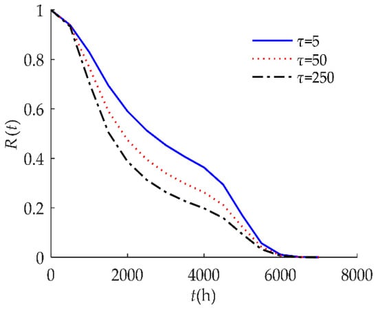 Figure 4 indicates that the self-recovery threshold τ had a significant effect on R(t). When τ decreased, the reliability of the humidity sensor increased after 1000 h. As discussed in Section 3.3, the smaller the value of τ, the higher the reliability of the products.
