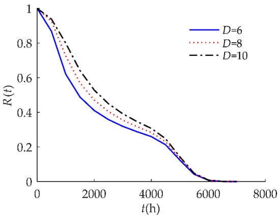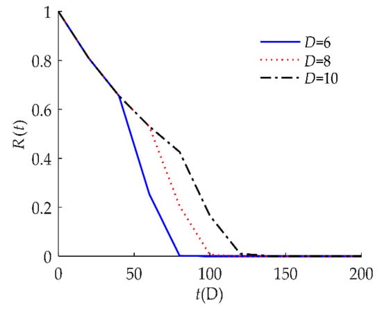 Figure 5 indicates that R(t) as sensitive to the soft failure threshold D. When D decreased from 10 to 6, R(t) decreased, which means that the reliability is lower when D gets smaller.