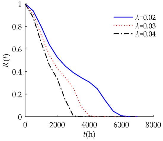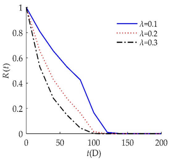 In Figure 7, we observed that R(t) was susceptible to the random shock rate λ. When λ decreased, R(t) shifted to the right. This result indicates that a larger λ decreases reliability performance. An explanation for this might be that the higher the shock rate, the more positive offsets on the degradation value, so failure occurs at a much earlier time.