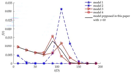 Comparison of f(t) for different models for example I.