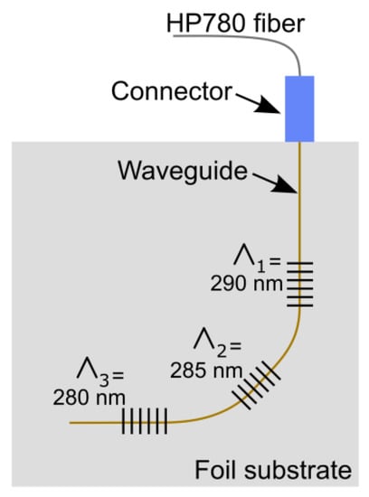 The novelty of the current paper is the development of sensor foils operating in the very near-infrared wavelength range around 850 nm, for several reasons. Firstly, the optical material losses of the available optical polymers are the lowest in this wavelength range, which potentially allows longer waveguides in which more sensors can be multiplexed. Secondly, we have previously shown that it is possible to realize an ultra-thin and compact Bragg grating based sensing system completely integrated with sources and detectors []. This approach requires suitable VCSEL chips, which are currently not yet largely available at telecom wavelengths. Finally, sensors operating below a wavelength of 1000 nm are compatible with largely available and low-cost Si-based detectors.