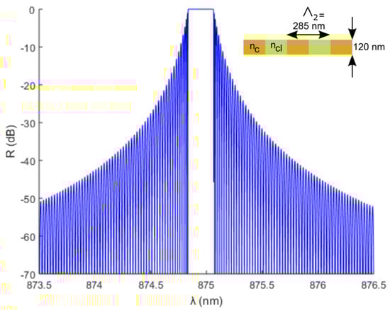 Calculated reflection spectrum for grating sensor 2 with dimensions as shown in the inset.