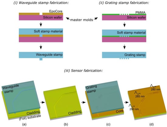 The Ormocer®-based waveguide Bragg grating sensors were realized on a 175 µm thick Polyethylene terephthalate (PET) foil carrier employing imprinting lithography for patterning the required micro-and nanostructures. This technique consists of bringing a stamp with the required patterns in contact with the liquid and UV-curable Ormocer® layers. In our case, the stamp is made from a transparent, soft polymer material so that the Ormocer® can be UV cured while the stamp is in contact thereby permanently fixing the patterns in the material. Two imprinting steps are required to realize the sensor. A first imprinting step is used to define the single mode waveguides by imprinting a microchannel with the required dimensions in the polymer “cladding” material after which this channel is filled by spin-coating a polymer “core” material. A second imprinting step is used to define the grating sensors in this core material. Both imprinting steps require a suitable polymer soft stamp, which is in itself a replication of a so-called master mold. The process of fabricating the two master molds, the two soft stamps, and finally the flexible sensor foil is described in detail below and illustrated in Figure 3.