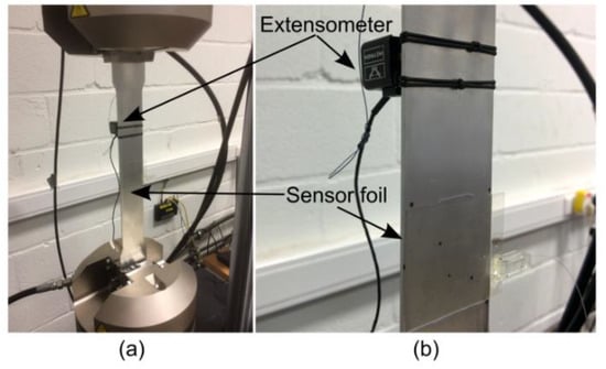 (a) Tensile test setup and (b) close-up view on the mounted sensor foil and extensometer.