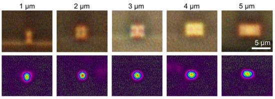 The fabrication process was validated by inspecting the cross-sections of waveguides having different widths (constant height of 3 µm) using a microscope, see Figure 6. The middle column corresponds with the waveguide used for realizing the sensors (cross-sectional dimensions 3 × 3 µm2). Since the refractive index contrast between the cladding material (OrmoClad–OrmoCore 1:1 mix) and the core material (OrmoCore) is very limited (0.007) and the waveguide structures were very small, backside illumination in combination with a high magnification objective was needed to visualize the core, making it more difficult to obtain sharp images. However, the figure clearly shows well-defined waveguide structures with very small residual layer on both sides of the core. Although the exact thickness of this residual layer could not be determined because of the limited spatial resolution of microscopy, it can be estimated well below 1 µm based on the cross-sectional images. To further optically characterize the waveguides, light (λ = 850 nm) was launched (using an HP780 single mode fiber, Thorlabs, Newton, NJ, USA) into a straight waveguide section from 1 side, and the mode profile was imaged at the other side using a near-field beam profiler (Spiricon SP620U in combination with a near-field accessory using a 20× objective, Ophir, Darmstadt, Germany). The figure shows the mode profiles of the fundamental modes recorded for each waveguide, indicating that the light remains confined in the waveguide core without leaking into a possible residual layer. Furthermore, for the waveguides with a width equal or below 3 µm, no higher order modes could be excited, indicating the single mode behavior of these waveguides.