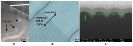 (a) Gratings imprinted in the waveguide core layer, visualized before applying the top cladding layer; (b) a magnified view on the diagonally oriented grating; (c) Imprinted OrmoCore grating cross-section.
