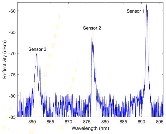 Reflection spectrum of the sensor foil showing the Bragg wavelength of the three sensors multiplexed in the same waveguide.