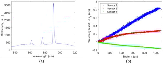 Figure 9 shows a typical sensor reflection spectrum as recorded by the readout system and the resulting wavelength shift recorded for the three sensors as a function of the strain measured by the extensometer. As expected, the sensor which is oriented along the loading direction shows the highest sensitivity, i.e., 0.85 pm/µε. Since the sensitivity of a Bragg grating sensor scales with the operating wavelength, it is convenient to consider the wavelength normalized sensitivity, i.e., (0.85 pm/860 nm)/µε or 0.99 ppm/µε. This result is in line with previous experiments, in which the sensitivity of a similar Bragg grating sensor, but operating at 1540 nm, was determined to be 1.4 pm/µε, or 0.91 ppm/µε []. The wavelength normalized strain sensitivity of a typical commercially available silica-based optical fiber Bragg grating sensor is slightly lower, i.e., 0.77 ppm/µε [].