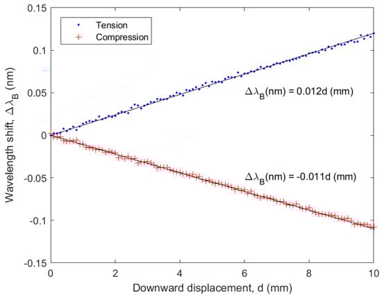 To verify whether the sensor sensitivity is the same in compression and in tension, an additional cantilever deflection test was performed. The same aluminum test specimen with attached sensor was therefore mounted in a horizontal position and clamped on 1 side, while an increasing vertical deflection was applied on the other side by pushing it down using a motorized translation stage. This experiment was performed both with the sensor facing up (loading in tension) and down (loading in compression), with the same loading conditions. In both cases, the wavelength shift experienced by the sensor parallel to the long axis of the test specimen was recorded as a function of the applied deflection.