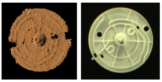 Moreover, 3D key point descriptors are used for pose estimation [9,10,11,12] with 3D inputs such as point clouds and depth images. Aldoma et al. [11] have proposed computing the clustered viewpoint feature histogram descriptor using a smooth region growing algorithm in order to conduct pose estimation in a short time. However, it relies heavily on segmentation and does not show good performance for industrial parts. To obtain a better performance for industrial parts, Drost et al. have proposed a state-of-the-art pose estimation algorithm using 3D point clouds [12]. They have combined a voting scheme and Point Pair Feature (PPF), which enables pose estimation of industrial parts in a clustered scene regardless of occlusion. Wu et al. have constructed a real bin picking system using the method proposed by Drost et al. for pose estimation [13]. However, the performance of this method [12] drops in the presence of many outliers and has bad performance in normal estimation, as stated in [14]. To solve the problem caused by outliers, Birdal et al. have coupled object detection with segmentation, where each segment is subject to disjoint pose estimation [15]. Applying a weighted Hough voting and an interpolated recovery of pose parameters, all the generated hypotheses are tested via an occlusion-aware ranking and sorted. With this combination, they have increased the detection rate and the accuracy of the resulting pose while reducing the complexity of the algorithm. However, this method is still highly dependent on the estimation of the normal. For the part shown in Figure 1, the normal calculated from the point cloud of a scene is different from the normal calculated from the model point cloud. This is because the captured points near the ridge differentiate the real appearance of the part. The ridges are 3 mm thick on this part, too thin to be captured by popularly-used commercialized 3D sensors. Because the 3D information of the plane surface on the part is sufficient, but near ridges is insufficient, the pose can be calculated except the horizontal rotation.
