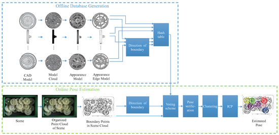 We propose an algorithm capable of estimating the pose of industrial parts using an organized point cloud as the input. The pipeline of this algorithm is shown in Figure 2. Similar to the method proposed by Drost et al. [12], this technique can be divided into two phases: offline database generation and online pose estimation.