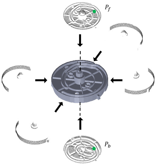 Given a model point cloud, N viewpoints are selected around the object, and consequently, N appearance models are extracted. We chose six () viewpoints, that is a small subset of endless arbitrary viewpoints in a real situation. However, all points in the model are considered. Many viewpoints are used in the method proposed by Drost et al. [25], but some visible point models do not differ much, which reduces the accuracy and increases the computation time. The visible points’ extraction is based on the method proposed by Katz et al. [18]. For each appearance model, the PPFs of every two points are calculated and saved into one hash table. In order to record the point pair and to which model it belongs, each point in the six models has a unique index. The point pairs with the same feature are saved in the same slot, and the B2B-TL is used as the key, which is similar to Drost’s method.