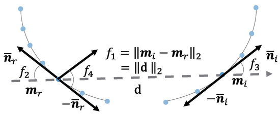 where d is the vector from the reference point to the referred point and represents the angle between two vectors. The first component of this feature, , represents the Euclidean distance between the two points. The second and third components, and , are sharp angles between the vector d and tangent lines that pass through point and point , respectively. The fourth component is the sharp angle between these two tangent lines. Considering that the direction of tangent lines that pass each point could be or simultaneously, we only utilize the sharp angle of . Similar to the method proposed by Drost et al. [12], the distances and the angles are sampled in steps of and .