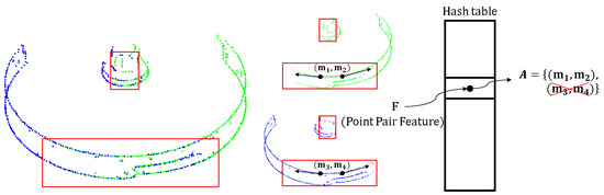 where and are the minimum coordinate components of the model cloud; and are the indices of each axis; and is the length of the voxel. For example, we use vector and vector to represent these two points in the voxel space, then the point pair is encoded by . Because the is located in the same position, it is also encoded by . With this encoding method, we remove the repeated point pairs from the hash table as shown in Figure 6.