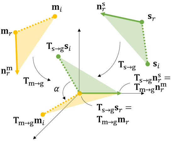 In this paper, we use a voting scheme conducted in the 2D space using local coordinates, as proposed by Drost et al. [12]. Given a scene point pair , its B2B-TL is calculated and used as the key to find the corresponding point pair in the hash table. An improvement is proposed in that if the distance between the two points is longer than , the longest distance in the model, then this point pair will not be considered in later steps. We then align the reference points of pairs and at the origin of an intermediate coordinated system, as shown in Figure 7. Their tangent lines and are aligned to the x-axis. The referred points and are aligned by rotating around the x-axis. The rotation angle and the reference model point compose the local coordinate . The transformation from to is calculated with the following equation.