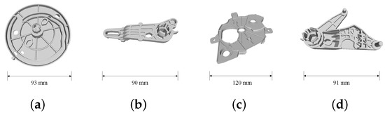 Industrial parts used to verify the proposed method. We named these parts as Part A (a), Part B (b), Part C (c) and Part D (d). They are made of resin and used in a real car air-conditioning system. The appearance of these parts is complex, making the pose estimation more difficult compared to cases in which the parts have primitive shapes.