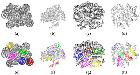 (a,b,c,d) are the simulated scenes of the example parts. We estimated 5 poses in each scene, and (e,f,g,h) are the results of the pose estimation. The model point cloud is transformed to the scene space using the pose estimation results and rendered with different colors. These colors indicate the recommendation rank to grasp the part after considering occlusion. Models 1–5 are rendered in red, green, blue, yellow and pink, respectively.