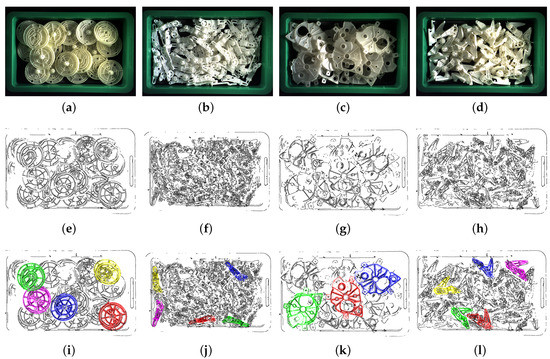 (a,b,c,d) are the real scenes of the example parts. (e,f,g,h) are the boundary points of the scene cloud. (i,j,k,l) are the results of pose estimation. The model point clouds are transformed to the scene space using pose results and rendered with different colors. These colors indicate the recommendation rank to grasp the part after considering the occlusion. Models 1–5 are rendered as red, green, blue, yellow and pink, respectively.