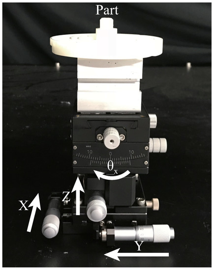 To evaluate the pose error for each part, we used a multi-axis stage unit (Misumi Group Inc., Tokyo, Japan) as shown in the Figure 12, to conduct this experiment.When we fixed an object on this stage, we could move the object by a determined distance with a precision of 0.01 mm or rotate the object by a determined angle with a precision of . We estimated the pose for Part A at an initial position. We then moved the part by a specified distance, namely 5 mm, 10 mm, 15 mm and 20 mm, and estimated its respective pose. The error between the moved distance and calculated distance was then computed (the distance can be calculated by comparing the current and initial poses). We repeated this process 10 times, and the average error of translation was obtained. The error of orientation was obtained similarly. After we estimated the part at an initial position, we rotated it by a specified angle, namely , , and , and estimated its respective pose. Because of the limitation of the structure of this stage, we estimated the error of translation and orientation separately. The results are shown in Figure 13. Because it is very difficult to obtain the absolute pose, we used an indirect way to show that the pose error attained with our method is small enough for a bin picking system.
