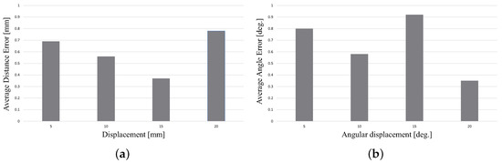(a,b) are the results of the relative error experiment. The part is moved by 5 mm, 10 mm, 15 mm and 20 mm using the stage. Pose estimation was performed each time we moved it. The moved distance was calculated by comparing the differences in the pose results. We conducted 10 trials for one part, and the average distance error is shown in (a). Similarly, we rotated the part by , , and , and the corresponding results are shown in (b).