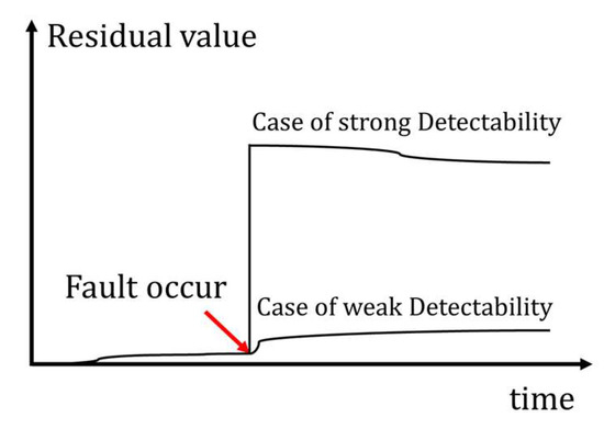 In previous fault diagnosis studies, the concept of fault detectability has been presented as in Figure 3 [19]. In this paper, the detectability of the fault is considered using residual sensitivity. For the fault isolation, the sensitivity of each residual equation is analyzed, and the fault isolation table is also derived from the analysis of residual equations for the fault detectability.