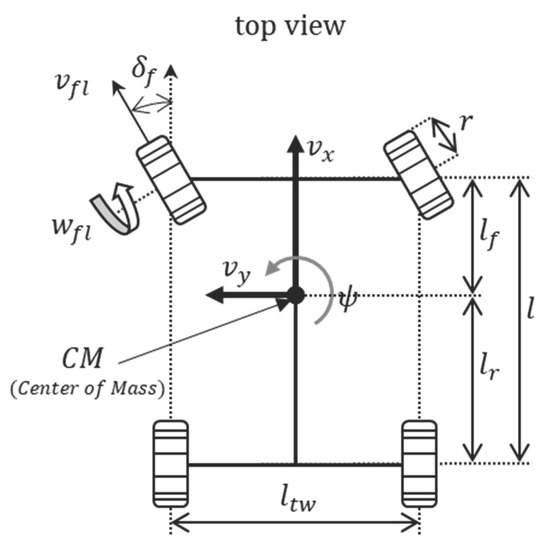 Figure 5 shows vehicle wheel with the mass center of the vehicle. Equations (10) and (11) are equations for the front left and right wheel speeds, where is the longitudinal speed of the vehicle, is the yaw rate, is the track width, is the length of the wheel base, is the lateral speed of the vehicle, is the longitudinal speed of the front left wheel, is the longitudinal speed of the front right wheel, is the longitudinal speed of the rear left wheel, and is the longitudinal speed of the rear right wheel [27,28].